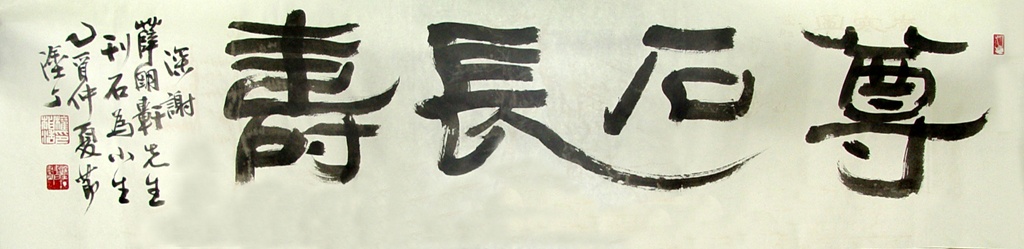 中國 天津의 篆刻家 薛明軒 선생께서 권상원 사장편에 내 인장을 훌륭한 돌에 새겨 선물로 보내왔다. 이에 감사의 뜻으로 薛선생께 써 드린 글씨다. 돌을 존중하면 오래 산다는 뜻이다.