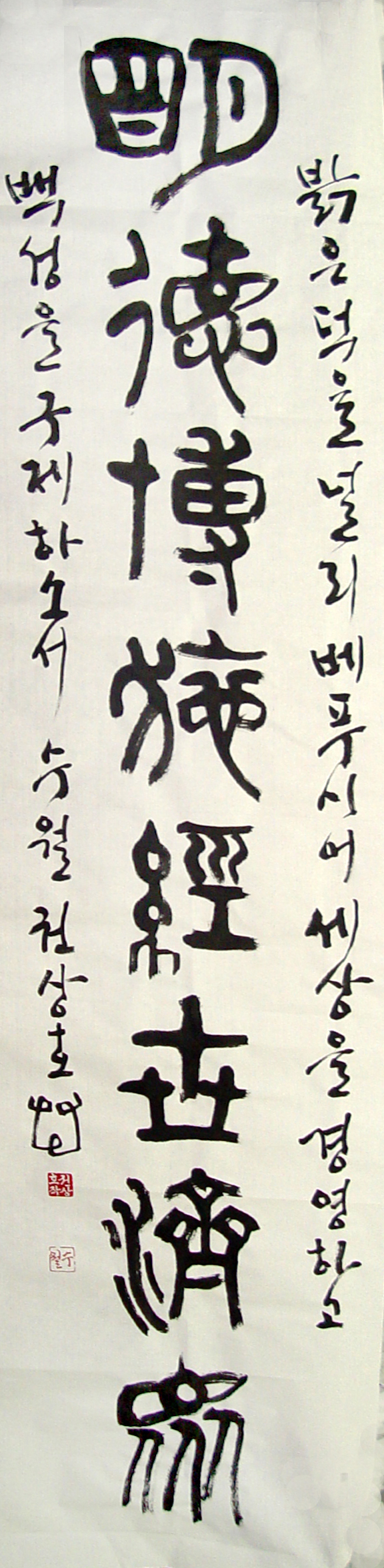 * 주: 李明博 대통령의 ‘明’자와 ‘博’자를 이용하여 지은 경구이다. 이념의 정부에서 ‘실용의 정부’를 지향하고 있는 바, 經濟란 단어를 활용하였으며, 대한민국이 국제사회에서 선도적 역할을 담당하고, 나아가 우리 대통령이 국제적인 지도자로 존경 받기를 바라는 뜻에서 ‘經世’를 썼고, 물론 民生 內治가 최우선 과제이므로 ‘濟衆’으로 귀결하였다.