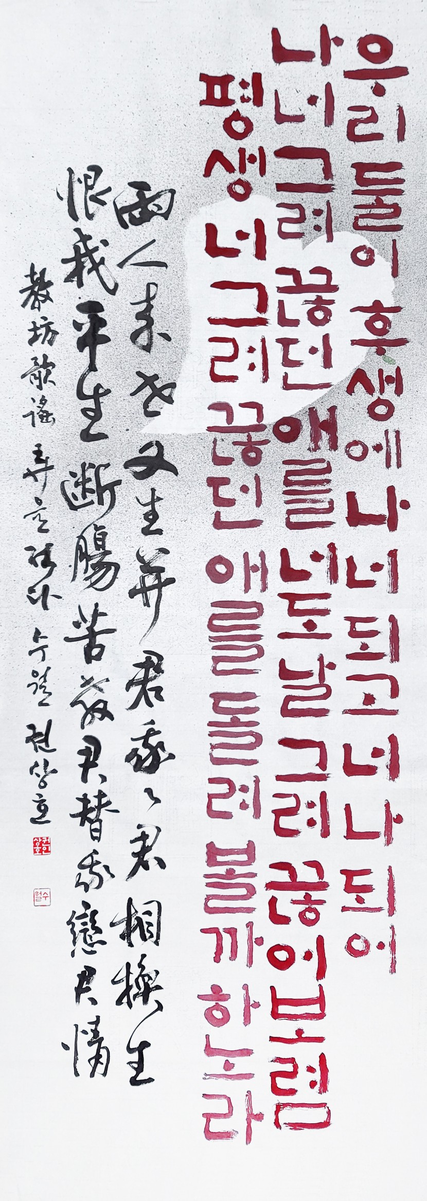 <제작 의도, 내용 > 우리 둘이 죽어 다음 생에는 내가 너 되고, 너는 나 되어 내가 너를 그리워하여 애끊는 마음을 너도 나를 그리하며 끊어보렴. 평생 너를 그리워하여 애끊는 마음을 돌려볼까 하노라. (한역) 兩人來世又生幷(양인내세우생병) 우리 둘이 내세에도 서로 같이 태어나되 君我我君相換生(군아아군상환생) 그댄 나 되고, 난 그대 되어 서로 바꿔 태어나세. 恨我平生斷腸苦(한아평생단장고) 한스럽구나, 한 평생 애간장 끊던 괴로움 敎君替我戀君情(교군체아연군정) 그대 그리워하던 이 마음을 당신도 겪어보려무나. | ||||||||