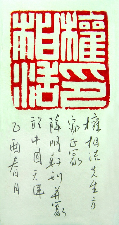 지난 2월 中國 天津을 방문한 바 있다. 거기서 몇몇 문인과 서예가를 만났고 그 중에 전각가 설명헌 선생께서 약속한 대로 내 성명인을 훌륭한 돌에 새겨 보내 왔다. 나는 이에 대한 감사의 뜻으로 글씨 한 작품을 써 보냈다. 아래 펜글씨는 측관의 내용이다. - 權相浩印