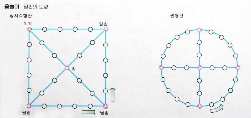윷놀이 방법 : 토너먼트, 4개의 말, 마지막 말은 날밭에 꼭 들어맞아야 됨.