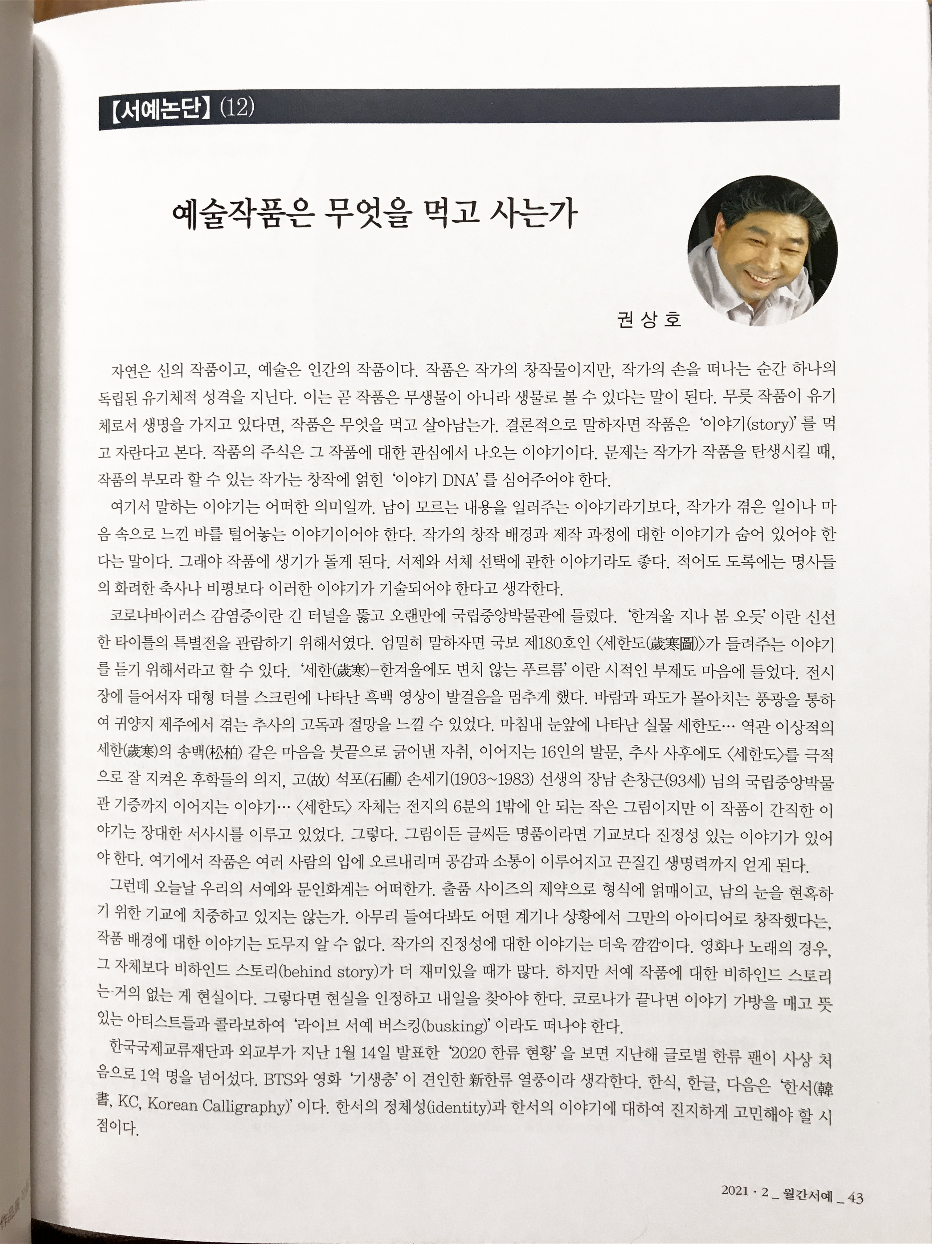 한국국제교류재단과 외교부가 지난 1월 14일 발표한 ‘2020 한류 현황’을 보면 지난해 글로벌 한류 팬이 사상 처음으로 1억 명을 넘어섰다. BTS와 영화 ‘기생충’이 견인한 新한류 열풍이라 생각한다. 한식, 한글. 다음은 ‘한서(韓書, KC, Korean Calligraphy)’이다. 한서의 정체성(identity)과 한서의 이야기에 대하여 진지하게 고민해야 할 시점이다.