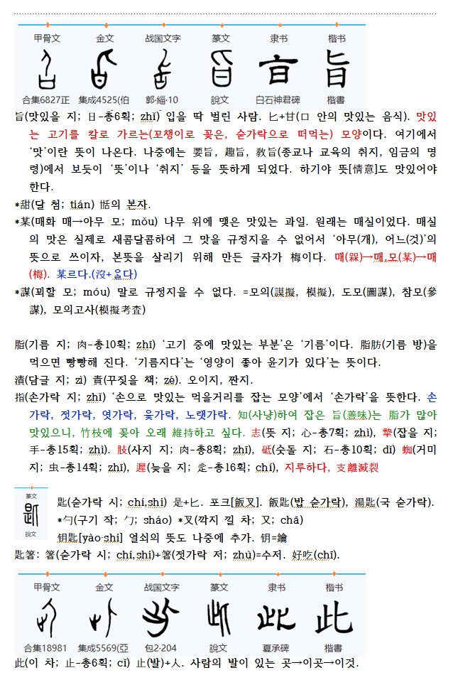 旨(맛있을 지; ⽇-총6획; zhǐ) 입을 딱 벌린 사람. 匕+甘(口 안의 맛있는 음식). 맛있는 고기를 칼로 가르는(꼬챙이로 꽂은, 숟가락으로 떠먹는) 모양이다. 여기에서 ‘맛’이란 뜻이 나온다. 나중에는 要旨, 趣旨, 敎旨(종교나 교육의 취지, 임금의 명령)에서 보듯이 ‘뜻’이나 ‘취지’ 등을 뜻하게 되었다. 하기야 뜻[情意]도 맛있어야 한다.