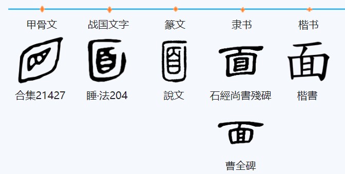 面(낯 면; miàn) 낯(얼굴, 出必告反必面), 面구하다. 面구스럽다(낯을 들고 대하기가 부끄럽다) 平面(평면), 행정구역 단위(面面村村). 국수. 향하다(面壁修道) 口訣에서 伊丆, 爲丆