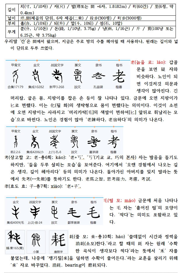 老(늙을 로; lǎo): 갑골문을 보면 疑 자와 비슷하다. 노인이 되면 이것저것 의문과 생각이 많아진다. 긴 머리칼, 굽은 몸, 지팡이를 잡은 손 등이 잘 나타나 있다. 금문에 오면 지팡이가 匕로 변했다. 이는 化(될 화)의 생략형으로 몸이 변했다는 의미이다. 이것이 소전에 오면 지팡이는 사라지고 ‘머리카락[毛]의 색깔이 변하여[匕] 앞뒤로 휘날리는 모습’으로 바뀐다. 노인은 경험이 많아 ‘老鍊하다, 老宿하다’의 의미가 나온다.