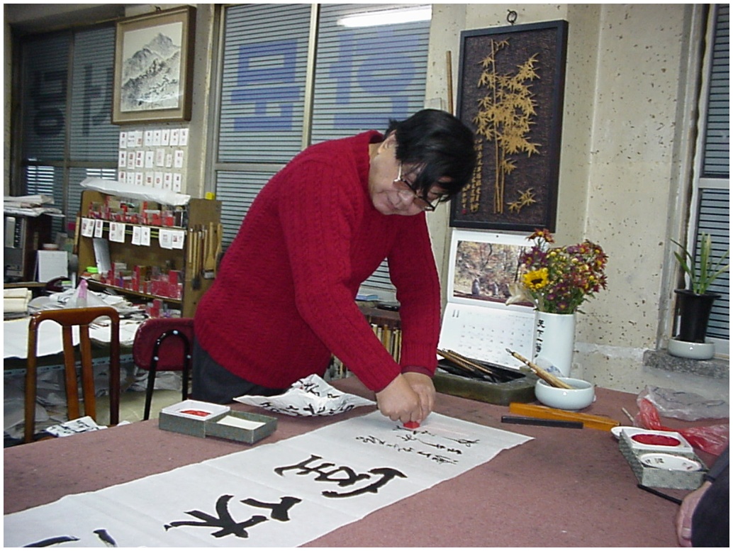 내 서실의 당호 '浮休室'을 쓰고 낙관을 하고 있다.