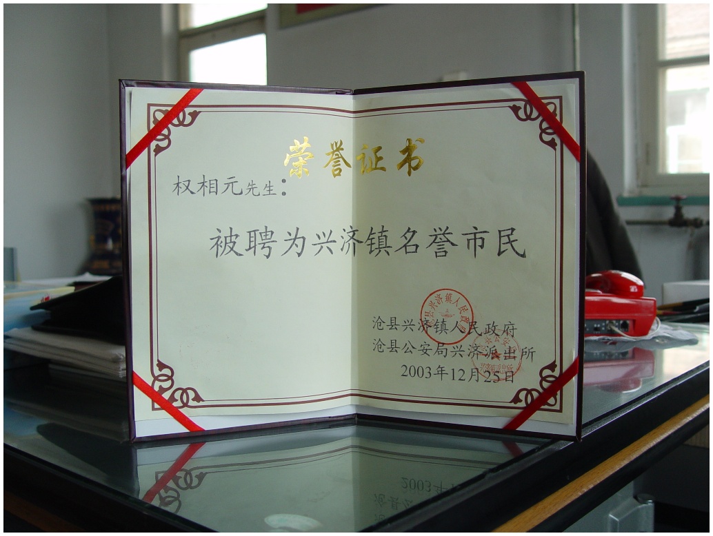 창현 흥제진 인민정부로부터 받은 명예시민증