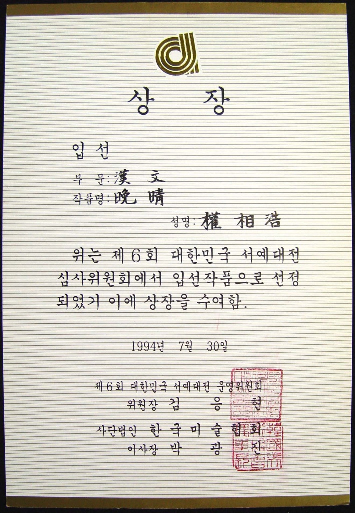 제6회 대한민국 서예대전 입선