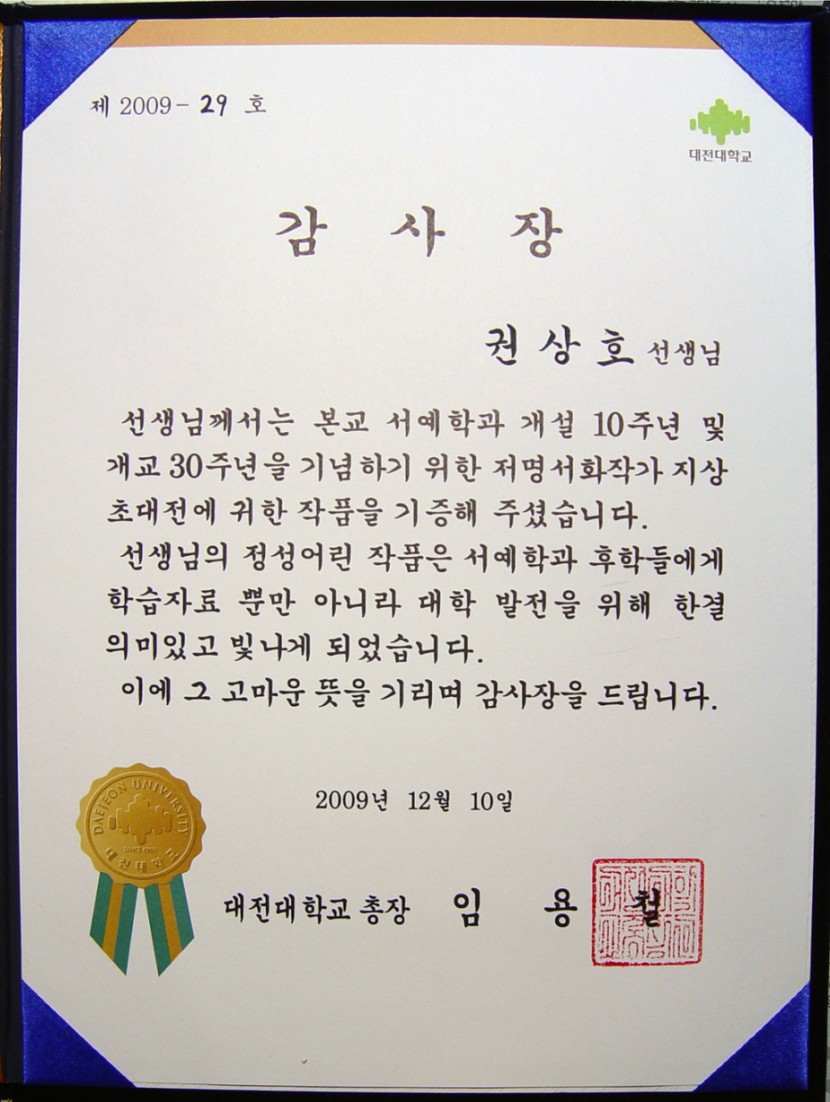 대전대학교 박물관에서 보내온 감사장