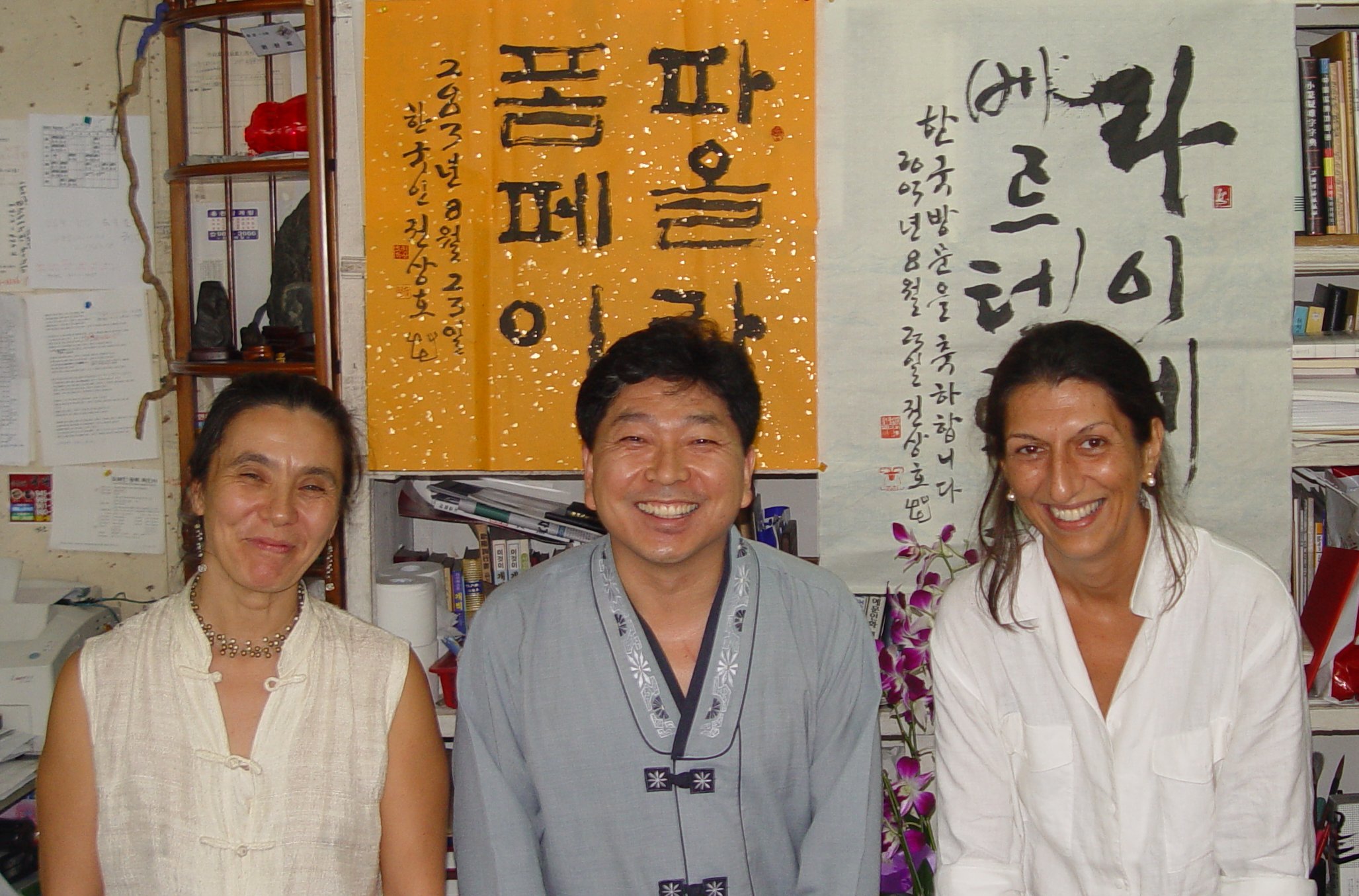 대구 하계 유니버시아드 기념 서예전 참가차 한국에 온 두 유럽 서예가 두분이 내 연구실을 방문하였다. 프랑스의 베르텔로트와 이탈리아의 파올라가 그들이다. 신일서예원 방문 기념으로 그들의 이름을 붓으로 써 주었더니 그들 역시 내 이름을 붓으로 써 주었다. 베르텔로트씨는 기념으로 유화 그림 두 장을 그려 주었다. 유럽 서예의 교두보가 되기를 기원한다.