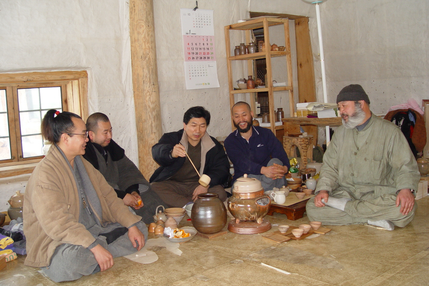 아래 : 좌로부터 海坡 선생, 幻境 스님, 나, 朴達 陶士, 無心 居士