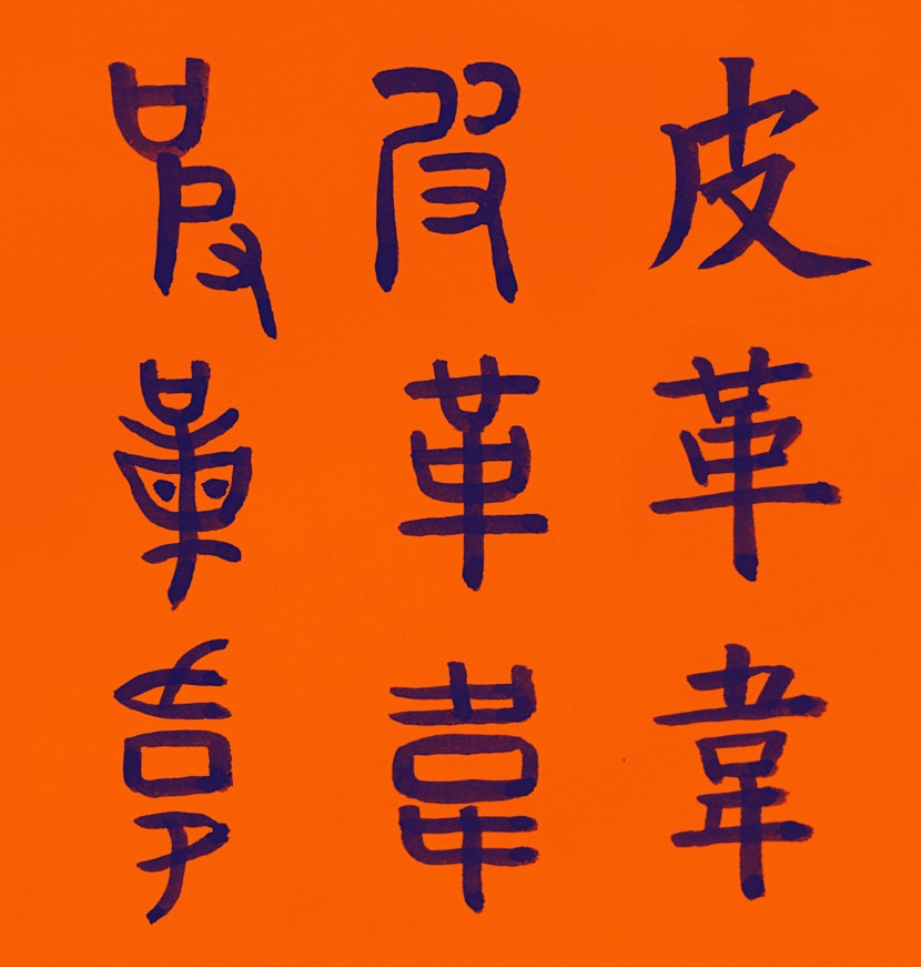 ‘가죽 혁(革)’ 자는 금문에 처음 보이는데, 짐승의 털을 완전히 제거하고 무두질하여 말리는 모습이다. 혁(革) 자의 금문 모양을 보면 머리와 꼬리도 온전히 남아있는데, 그 중간의 네모 부분이 가죽이다.