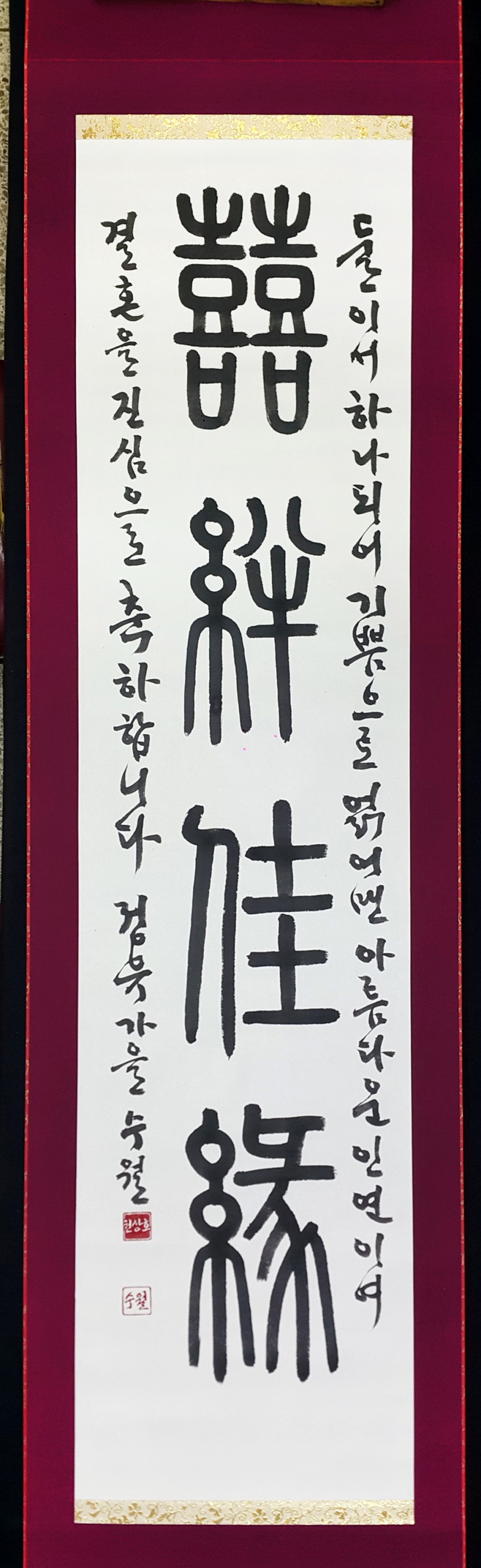 囍絆佳緣(희반가연) 둘이서 하나되어 기쁨으로 얽어맨 아름다운 인연이여... 결혼을 축하합니다. 정유 가을 수월 권상호.