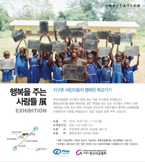 국제아동후원기구 플랜코리아와 한국미술협회가 주최하는 이번 전시회는 지난 4월 지구촌 어린이 희망 결연 협약을 맺고 후원을 해오고 있는 작가들이 참여하고, 전시를 통한 작품의 판매 대금은 플랜의 개발도상국 어린이들의 교육사업을 후원하는데 기부된다. <?xml:namespace prefix = o ns = "urn:schemas-microsoft-com:office:office" /> 이번 전시는 김일해, 홍성자, 김춘옥 등 한국화단을 대표하는 작가들의 작품 80여 점이 선보일 예정이다. ‘행복을 주는 사람들-지구촌 어린이들의 행복한 학교 가기’ 라는 전시의 주제는 미술인들이 가진 재능을 통해 해외 빈곤지역 어린이들의 열악한 교육환경을 지원함으로써 함께 행복을 나누고자 하는 행사의 의미를 담았다.