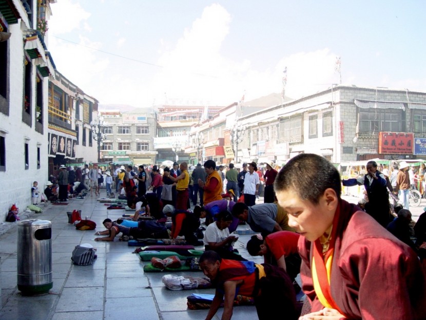 설성빈관(雪城賓館, Snow Land Hotel)에 짐을 풀고, 걸어서 10분 정도의 가까운 절 조캉사원(Jokhang, 大昭寺)을 들었다. 사원 앞의 비석에는 ‘포탈라궁’과 ‘조캉사원’을 유네스코에서 세계문화유산으로 등록되었다는 내용이 소상히 기록되어 있었다. 티벳어로 '부처의 집'이란 뜻을 지닌 조캉사원은 티벳에서 가장 오래된 절로 참배객 또한 가장 많다. 이른바 오체투지(五體投地)를 하고, 경전통인 마니차를 돌리는 인파들이 빼곡했다. 문맹자들을 위하여 안에다가 경전을 써놓고, 시계 방향으로 한번 돌리면 안의 경전을 한번 읽은 것과 같단다. 두 다리를 묶고 몸 앞에는 낡은 메트를 깔고, 손바닥에는 짐승 가죽 조각을 장갑처럼 걸치고, 진지한 표정으로 끊임없이 오체투지를 하는 모습을 보니, 신앙의 힘이 없었던들 어찌 이토록 척박한 땅에 사람이 어떻게 살 수 있었을까 하는 생각이 든다.