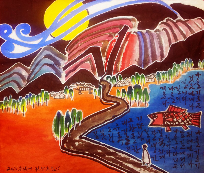 그림: 한글로 ‘길’자를 쓰고 그 위에 그림을 그렸다. 뭍길, 바닷길, 하늘길에 산길을 통하여 인생길을 더듬어보고자 했다.