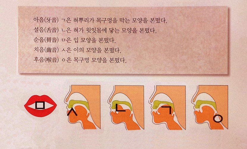 외국인에게 한글을 더욱 쉽게 가르치는 방법은 없을까? ‘기본자음 5자(ㅁ, ㅅ, ㄴ, ㄱ, ㅇ)의 발음기관 상형, 기본모음의 3자(ㆍ, ㅡ, ㅣ)의 천지인 상형’을 설명하는 두 장의 그림이면 충분하다. 기본자음 5자의 순서를 달리한 것은 발음기관 위치의 순차적 이동에 따른 것이다. 훈민정음 해례본의 ‘아음(牙音), 설음(舌音), 순음(脣音), 치음(齒音), 후음(喉音)’의 순서보다 ‘입, 이, 혀, 혀뿌리, 목구멍’ 순서로 가르치면 훨씬 이해가 빠르다.