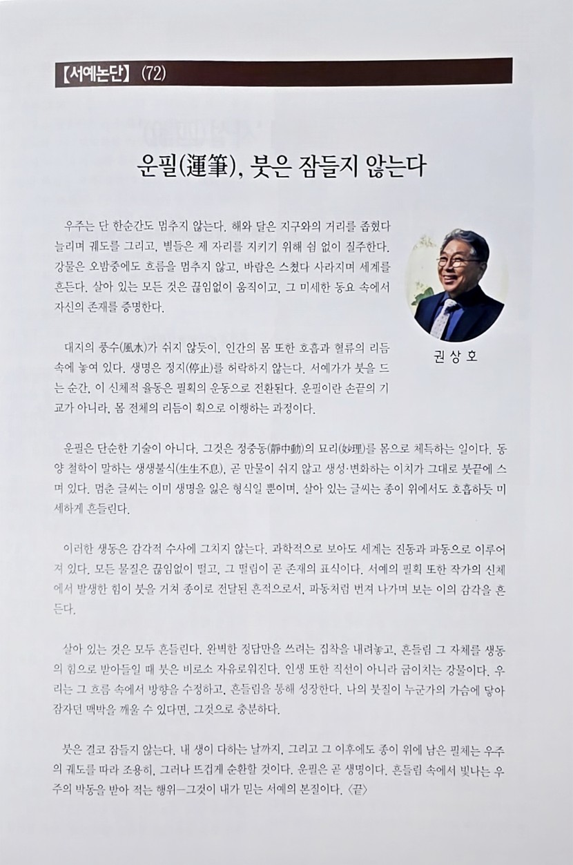붓은 결코 잠들지 않는다. 내 생이 다하는 날까지, 그리고 그 이후에도 종이 위에 남은 필체는 우주의 궤도를 따라 조용히, 그러나 뜨겁게 순환할 것이다. 운필은 곧 생명이다. 흔들림 속에서 빛나는 우주의 박동을 받아 적는 행위—그것이 내가 믿는 서예의 본질이다. <끝>