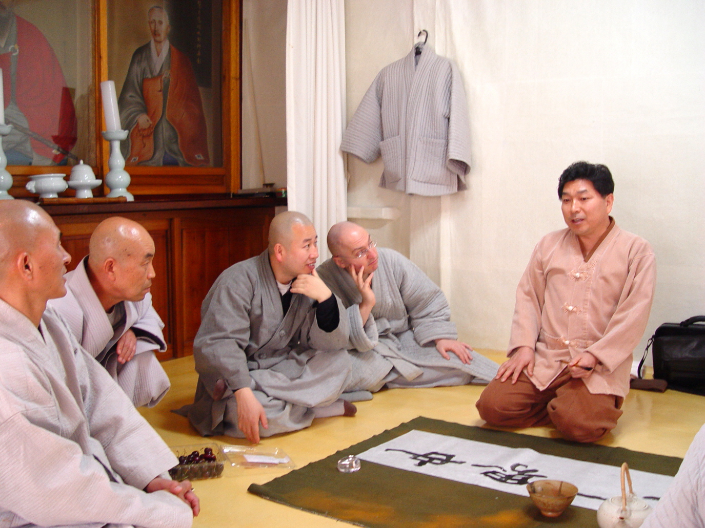 ->아래: 나의 휘호 뒤에 설명을 듣고 계시는 도호, 혜인, 환경, 현각 스님
