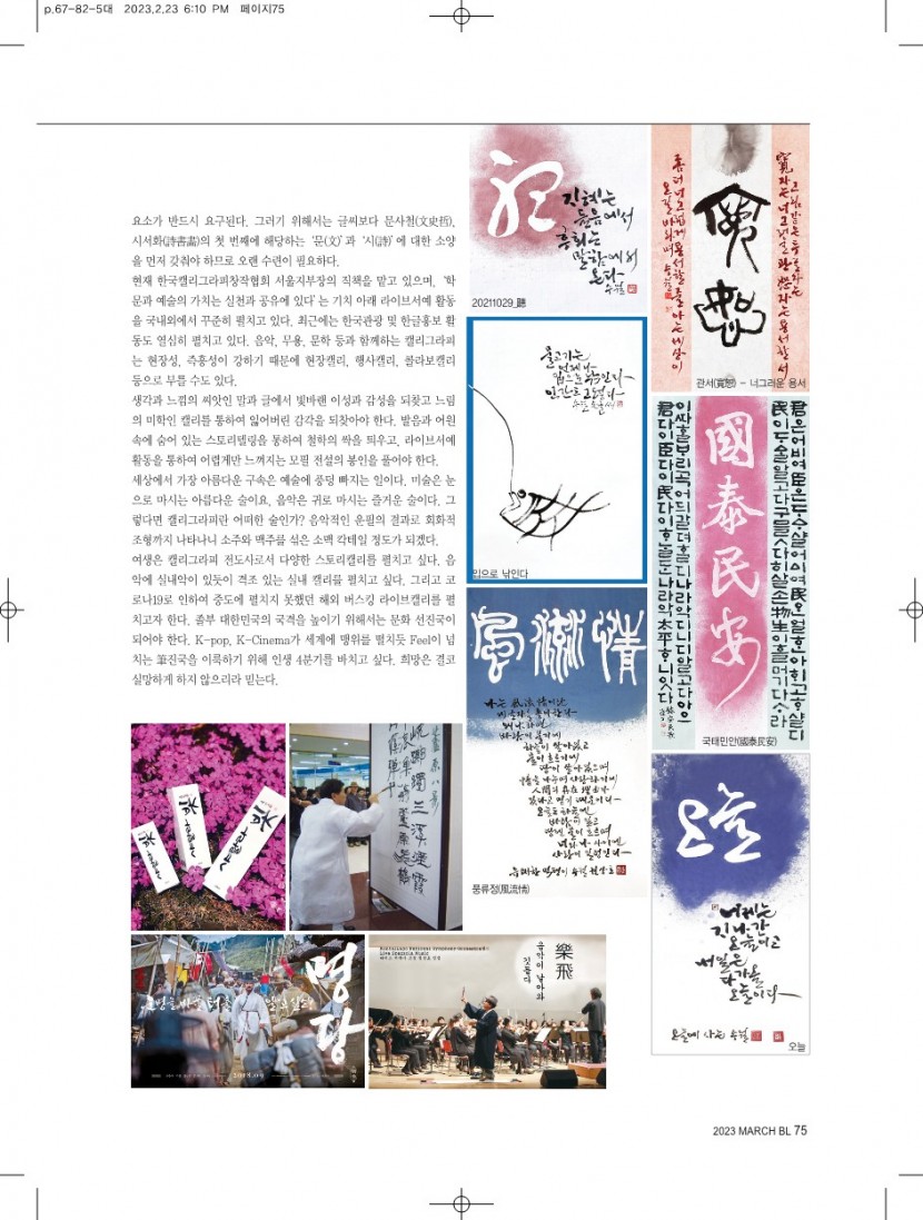 여생은 캘리그라피 전도사로서 다양한 스토리캘리를 펼치고 싶다. 음악에 실내악이 있듯이 격조 있는 실내 캘리를 펼치고 싶다. 그리고 코로나19로 인하여 중도에 펼치지 못했던 해외 버스킹 라이브캘리를 펼치고자 한다. 졸부 대한민국의 국격을 높이기 위해서는 문화 선진국이 되어야 한다. K-pop, K-Cinema가 세계에 맹위를 떨치듯 Feel이 넘치는 筆진국을 이룩하기 위해 인생 4분기를 바치고 싶다. 희망은 결코 실망하게 하지 않으리라 믿는다. (끝)
