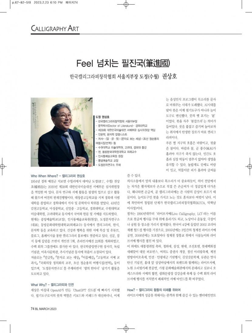 현재 한국캘리그라피창작협회 서울지부장의 직책을 맡고 있으며, ‘학문과 예술의 가치는 실천과 공유에 있다’는 기치 아래 라이브서예 활동을 국내외에서 꾸준히 펼치고 있다. 최근에는 한국관광 및 한글홍보 활동도 열심히 펼치고 있다. 음악, 무용, 문학 등과 함께하는 캘리그라피는 현장성, 즉흥성이 강하기 때문에 현장캘리, 행사캘리, 콜라보캘리 등으로 부를 수도 있다.
