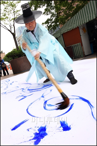 31일 오전 소공동 롯데백화점 앞에서 한국 서예학회 도정 권상호선생이 2010 남아공 월드컵을 앞두고 대한민국 국가대표팀의 선전을 기원하는 서예 퍼포먼스를 하고 있다.