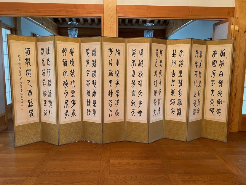 3·1운동 때 민족대표 33인의 한 사람으로, 구한말 독립운동가이자 서예가·언론인인 위창 오세창 선생께서, 82세 되던 봄날에, 당나라 시인 이태백이 지은 ‘춘야연도리원서’를, 전서체로 쓴 10곡병 명품입니다. 10곡으로 맞추기 위해 1곡에는 지은이와 제목을, 10곡에는 쓴 날짜를 더하였습니다.