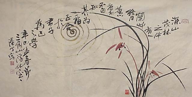 深山茂林之中 有一蘭草 終日薰香 而不自知其爲香 正合於君子爲己之學(깊은 산 무성한 수풀 가운데 한 포기 난초 있어서 종일 향기를 뿜으나 제 스스로는 향기됨을 알지 못함은 군자가 자기 학문이 늘어남을 깨닫지 못함과 같다): 내가 무지 좋아하는 퇴계 선생의 말씀이다. 畵題를 산 모양으로 하고 蘭香을 파동 이미지로 표현했다.