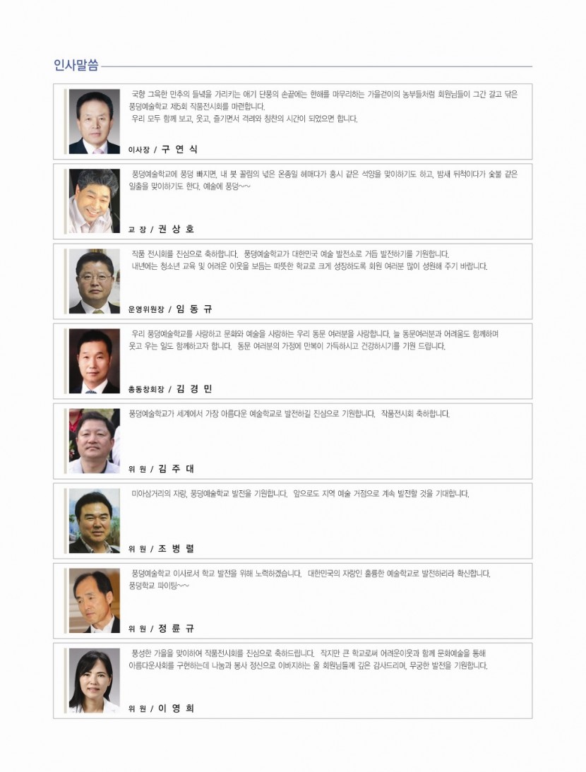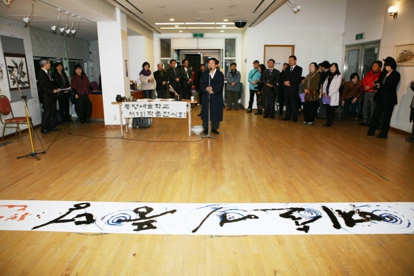 (인사말) 사실 표구를 잘하여 벽에 걸어 둔 멋진 글씨를 보는 것도 감흥을 주지만 점획을 긋는 순간마다 손끝에 와 닿는 변화무쌍한 느낌과는 비할 바가 못 된다. 이것이 라이브 서예의 즐거움이다. 풍덩에 풍덩 빠지면, 내 붓 꼴림의 넋은 온종일 헤매다가 홍시 같은 석양을 맞이하기도 하고, 밤새 뒤척이다가 숯불 같은 일출을 맞이하기도 한다.