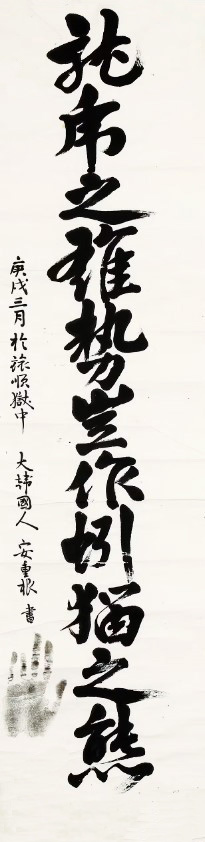 지난해 12월에 안중근 의사의 붓글씨 한점이 19억 5천만 원에 고국의 품으로 돌아왔다. 내용은 '龍虎之雄勢豈作蚓猫之態(용호지 웅세 기작 인묘지태, 34×135cm)' 11자로 態(모양 태)가 熊(곰 웅)으로 보이기는 하나 문맥으로 읽어야 한다. ‘용과 호랑이의 웅장한 형세를 어찌 지렁이와 고양이의 모습에 비견하겠는가?’ 안 의사의 육성이 들리는 듯하다.