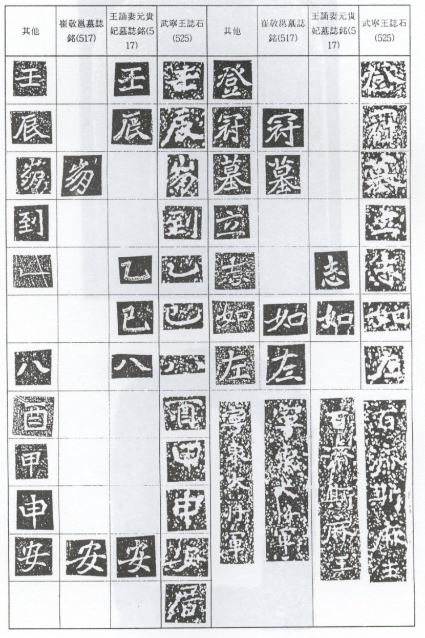 武寧王誌石의 글자 중에서 중복되는 자를 피하면 52자 중에서 43자만 남는다. 이 43자를 중심으로 공통 부분이 많은 북위 비를 찾아 본 결과가 ‘崔敬邕墓誌와 王誦妻元貴妃墓誌銘’이었다. 제한된 글자 수에서 비슷한 글씨를 찾기는 실제로 매우 어려운 일이다. 그리하여 비교 대상 글자 없으면 기타 諸碑에서 찾아보았다. 그 결과 武寧王誌石에 쓰인 書風은 氣骨이 씩씩한 北魏碑의 외형을 본받았으되, 筆劃의 맛은 아무래도 南朝 書風을 본af83525.gif" width="257" height="372" border="0"> 이 43자를 중심으로 공통 부분이 많은 북위 비를 찾아 본 결과가 ‘崔敬邕墓誌와 王誦妻元貴妃墓誌銘’이었다. 제한된 글자 수에서 비슷한 글씨를 찾기는 실제로 매우 어려운 일이다. 그리하여 비교 대상 글자 없으면 기타 諸碑에서 찾아보았다. 그 결과 武寧王誌石에 쓰인 書風은 氣骨이 씩씩한 北魏碑의 외형을 본받았으되, 筆劃의 맛은 아무래도 南朝 書風을 본af83525.gif" width="257" heig