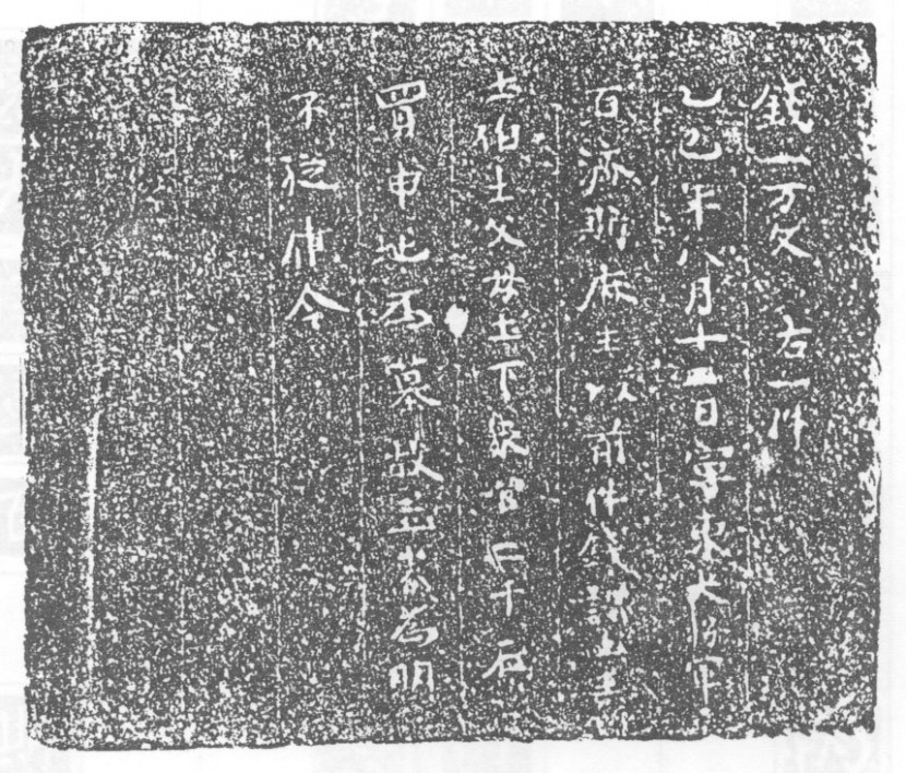 武寧王誌石의 뒷면에는 다만 十干과 十二支의 方位 표시가 있을 따름이나, 王妃誌石의 뒷면은 買地券1)인데 일종의 賣買契約書라 할 수 있다. 곧, 大王 葬禮時인 乙巳年(525년) 8月 12日에 一萬文의 돈으로 土王․土伯․土父母, 여러 地下官吏 등 地神으로부터 묘지를 사들인다는 내용의 賣買契約書이다. 이 買地券에는 58자의 銘文이 陰刻되었으며 그 내용은 다음과 같다.