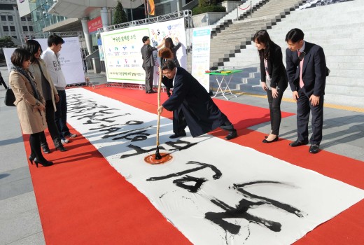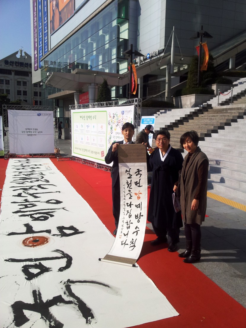 10월의 마지막 날, 암세포도 화들짝 놀랄 만큼 깔끔한 가을 하늘이었다. 이른바 티 하나 용납할 수 없는 蒼空(창공)이랄까. 새롭게 단장한 용산역 복합청사 앞에서, 보건복지부 후원, 국가암정보센터 주관으로 서울 용산역 앞 광장에서 ‘국민 암 예방 수칙 실천’을 위한 ‘라이브 서예’를 펼쳤다.