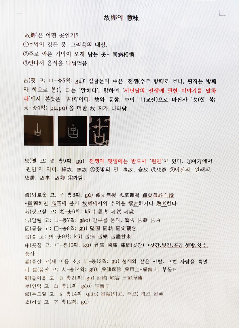 古(옛 고; ⼝-총5획; gǔ): 갑골문의 中은 ‘전쟁(주로 방패로 보나, 필자는 방패와 창으로 봄)’, 口는 ‘말하다’. 합하여 ‘지난날의 전쟁에 관한 이야기를 말하다’에서 본뜻은 ‘古代’이다. 故와 통함. 中이 十(교전)으로 바뀌자 ‘攵(칠 복; ⽁-총4획; pū,pǔ)’을 더한 故 자가 나타남.