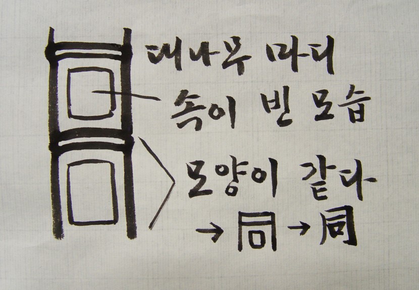 놀랍게도 /동/이라고 발음하는 한자에는 동굴처럼 속이 빈 글자들이 많다. 예컨대, 대나무 마디마디가 똑같지만 속이 빈 ‘같을 동(同)’, 악기 만드는 재료로 쓰이는 ‘오동나무 동(桐)’도 속이 비었으며, ‘구리 동(銅)’ 역시 보일러 시설을 할 때 사용되는 동 파이프 재료이다. 비슷한 발음으로 필통(筆筒)이라고 할 때의 ‘대롱 통(筒)’도 속이 비어야 사용할 수 있다.