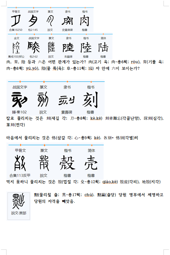 肉, 育, 陸 등과 六은 어떤 관계가 있는가? 肉(고기 육; ⾁-총6획; ròu), 育(기를 육; ⾁-총8획; yù,yò), 陸(뭍 륙{육}; ⾩-총11획; lù̀) 자 안에 六이 보이는가?