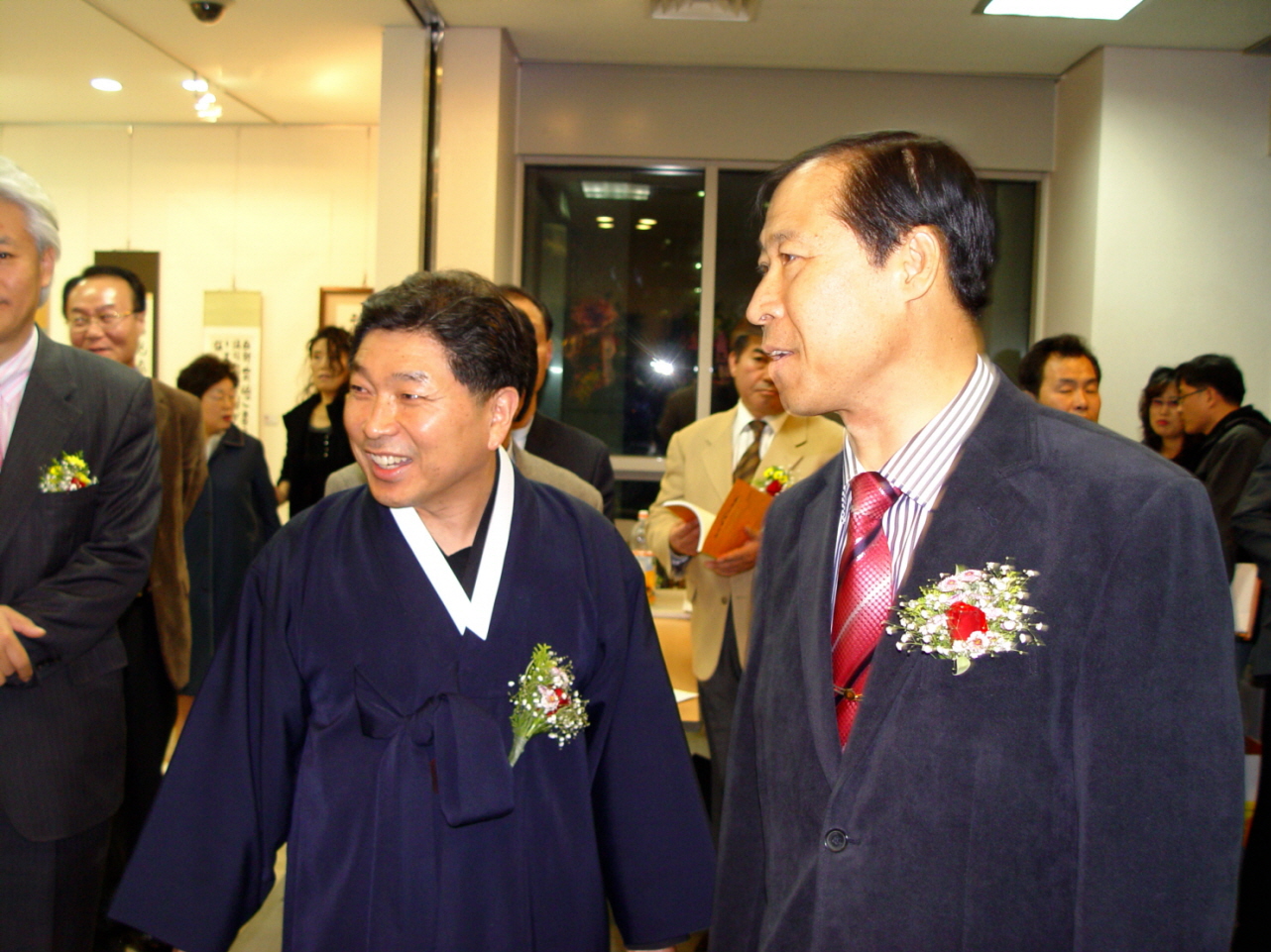 - 이노근 구청장님을 모시고 작품 설명중이다. 구청장님께서는 진정한 예술 행정가이시며, 모든 작품을 일일이 감상하시어 회원들의 존경을 받으셨다.