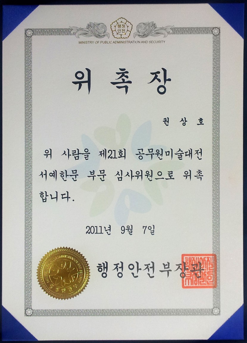 위촉장 - 행정안전부 주최 공무원미술대전 한문 심사