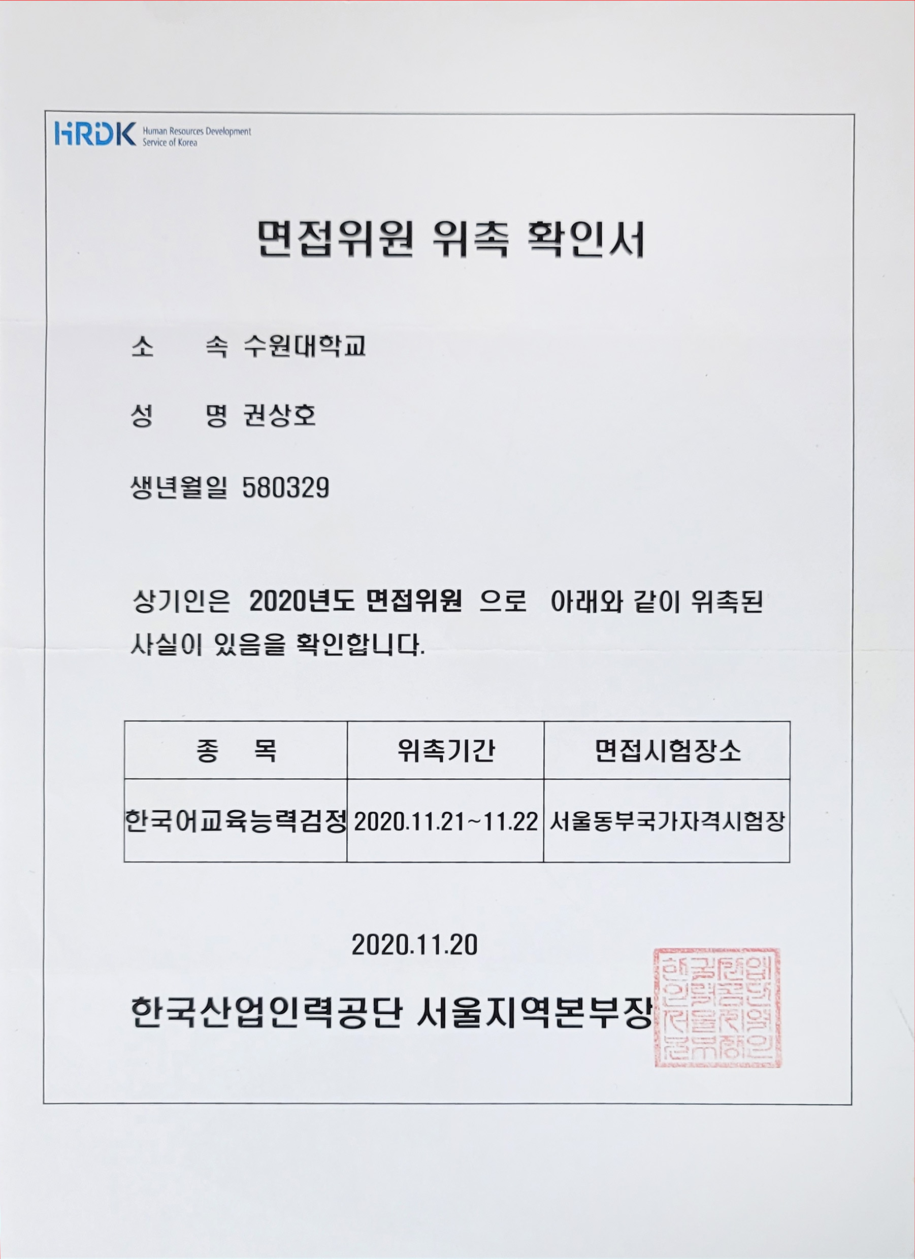 한국어교육능력검정 면접위원 위촉 확인서