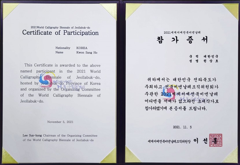 2021 세계서예전북비엔날레 '어디엔들 서예가 없으랴'전 초대작가 참가증서