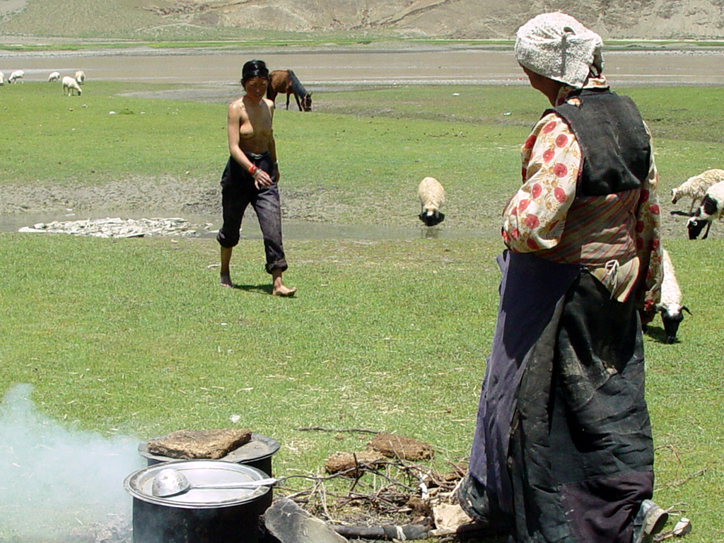 日喀則(르카치, Shigatse)에서 하룻밤을 보내고 아침 햇살을 받으며 일찌감치 길을 나섰다. 산을 등지고 도시의 반을 차지하고 있는 白居寺를 향해 오체투지를 하고 있는 사람들이 많이 눈에 띄었다. 도시를 벗어나자 여전히 시야를 가득 채우는 보리밭과 유체꽃밭이 이제 낯설지 않았다. 잠에서 깨어난 수백 마리의 양 떼들이 흑색 회색 백색의 조화를 이루며 빈틈없이 새로 돋아난 풀밭을 찾아 아침 식사를 하러 길을 나선다. 짐승의 똥을 줍는 열 댓 살 쯤 되어 보이는 청소년이 똥 망태기를 목에 걸러 카메라 앞에서 포즈를 취한다. 그에게 필요한 것도 역시 팁이다. 산 구비 돌아 외딴 길에서 무거운 물레를 들고 가는 부부의 표정에서 환경의 아픔을 극복한 풋풋한 부부의 정을 느낄 수 있다. 그들은 조건 없이 포즈를 취해 주었다. 강가에 무소, 야크, 말, 양 등을 풀어 놓고 온 가족이 모여 중식을 준비하는 모습에서 유목민의 참모습을 볼 수 있었다. 주름살 많은 늙은 할머니는 우리의 방문에도 아랑곳하지 않고 불을 지피기에 여념이 없다. 아이들은 개울가에서 발가벗은 채로 놀다가 카메라를 든 우리를 발견하고 코를 흘리며 ‘스위트, 스위트’ 하고 사탕을 달라는 것을 보니, 우리와 같은 사람을 자주 접했나 보다. 강가에서는 스무 살쯤 되어 보이는 처녀가 성숙할 대로 성숙한 가슴을 그대로 내놓고 이쪽으로 와서 윗도리를 걸친다. 모두 스무 명이 넘는 걸 보니 대가족인가 보다. 무리 중에 한두 사람은 중국어가 통하는데 이곳에서는 아무와도 대화가 되지 않는다.