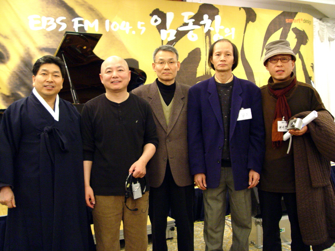 ->위: 좌에서부터 본인 피아니스트 임동창, 신장식 PD, 송형익 교수, 경기민요 소천 이장학 선생.