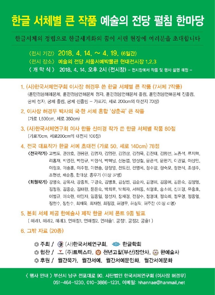 4월 14일(토)~4월 19일(목) 6일간 예술의전당 서울서예박물관에서 개최한다.