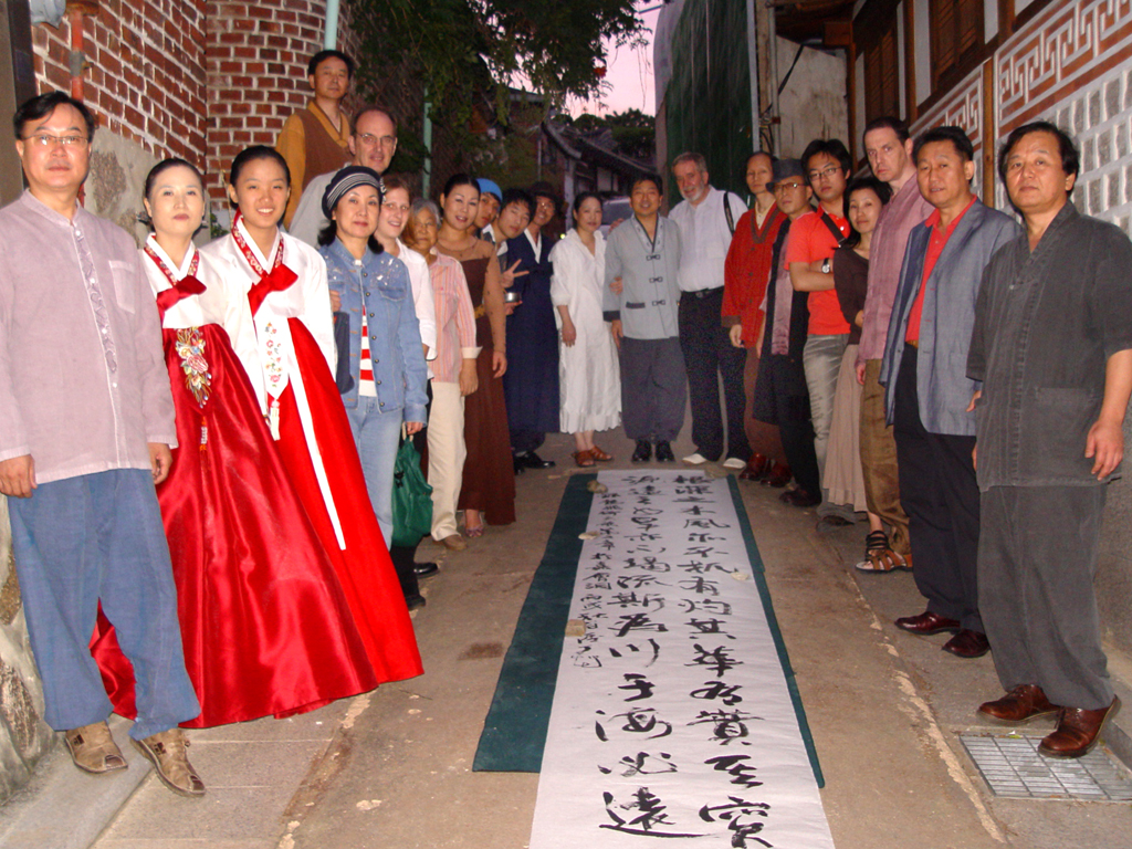 | * 사진은 거리 퍼포먼스를 마치고 출연자들의 기념촬영(본인을 중심으로 좌우에 킬번씨 내외와 내빈들) - 축제는 오후 3시부터 6시까지 이어졌다. 서예 퍼포먼스는 킬번씨의 한옥 안팎에서 진행되었는데, 집안에서는 한국 율려 춤 창시자 이귀선 선생의 축무와 대한민국 중요무형문화제 제41호 가사 이수자인 박종순(한국정가원 원장)씨의 가사창 및 대한민국 중요무형문화제 제45호 대금산조 이수자인 강성세씨의 대금 연주에 맞추어 실시했다. 마루 끝에 정중히 앉아 길다란 화선지에 글씨를 써서 내려뜨리면 이귀선씨는 이를 받아 들고 춤을 추면서 마당에 펼쳐 나갔다. 마루에서는 아래의 1과 2를 이어서 쓰고, 집앞 거리에서는 아래 3의 내용에 이어 참석자 모두가 사인을 했다. 한옥을 지키자는 덕담으로 여백을 메꾸어 나갔다. 이 날의 휘호 글씨는 UNESCO에 보내질 예정이라 했다. 휘호 내용은 다음과 같다. 1.'心賀 순수 한옥마을보존 발기인 대회'(피지에 주묵과 흑묵. 한옥의 순수 전통을 이어받자는 뜻에서 서체도 '전서->판본체->금체' 순으로 써 내려 갔다.) 2. 所望嘉會寶村萬歲(소망가회보촌만세) 期願韓屋原形保存(기원한옥원형보존) 가회동 보배로운 마을이 영원하길 소망하고 한옥은 원형이 잘 보존되기를 기원합니다. 3. 용비어천가 제2장 根深之木風亦不올有灼其華有분其實 源遠之水旱亦不竭流斯爲川于海必達 http://news.kbs.co.kr/article/society/200609/20060917/1221891.html ‘한옥 지킴이’ 부부의 특별한 가을축제 | ||