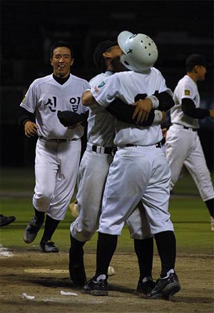 신일고 김병관 선수(맨앞)가 팀 동료인 나지완의 끝내기 밀어내기 볼넷으로 홈을 밟아 결승득점을 올린 후 동료들과 얼싸안고 승리의 기쁨을 나누고 있다.