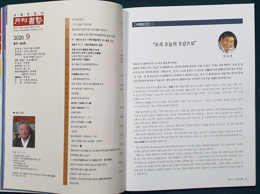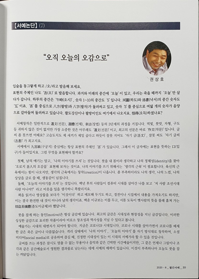 글씨를 쓰는 과정은 잠시도 멈출 수 없는 무용이나 음악과 같은 긴박한 시간예술이지만, 그 끝은 언제나 그림이나 조각과 같은 공간예술로서 영원한 결과물로 남는다는 데에 서예의 매력이 있습니다. 이것이 부족하나마 오늘도 붓을 잡는 까닭입니다. <끝>