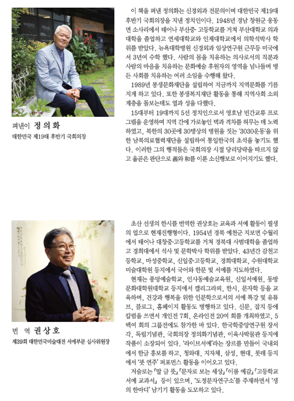 우연한 인연이 필연으로 이어져 늘 존경해 오던 정의화(鄭義和)의 전 국회의장님으로부터 연초에 전화가 왔다. 집 안을 정리하다가 초산(樵山) 정순용(鄭純鎔) 조부님께서 남긴 필사본 <여행시집(旅行詩集)>이 나왔는데, 번역을 부탁한다는 내용이었다. 나의 재능과 경험의 부족을 들며 극구 사양했으나 그동안의 의리와 인정을 앞세우며 하명(下命)하시기에 피할 도리가 없었다. 그리하여 가당치 않은 번역이 초산 선생의 주옥같은 한시(漢詩)에 누(累)가 되지 않을까 하는 염려와 구안자(具眼者)의 질타는 평생 지고 가야 할 짐으로 남았다.