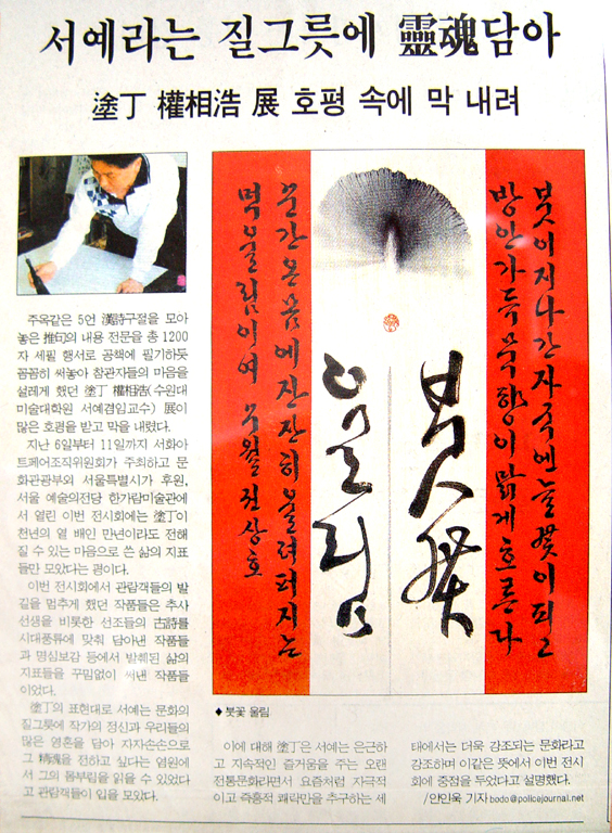 주옥같은 5언 漢詩구절을 모아 놓은 推句의 내용 전문을 총 1200자 세필 행서로 공책에 필기하듯 꼼꼼히 써놓아 참관자들의 마음을 설레게 했던 塗丁 權相浩(수원대 미술대학원 서예겸임교수) 展이 많은 호평을 받고 막을 내렸다.지난 6일부터 11일까지 서화아트페어조직위원회가 주최하고 문화관광부외 서울특별시가 후원, 서울 예술의전당 한가람미술관에서 열린 이번 전시회에는 塗丁이 천년의 열 배인 만년이라도 전해질 수 있는 마음으로 쓴 삶의 지표들만 모았다는 평이다. 이번 전시회에서 관람객들의 발길을 멈추게 했던 작품들은 추사 선생을 비롯한 선조들의 古詩를 시대풍류에 맞춰 담아낸 작품들과 명심보감 등에서 발췌된 삶의 지표들을 꾸밈없이 써낸 작품들이었다.塗丁의 표현대로 서예는 문화의 질그릇에 작가의 정신과 우리들의 많은 영혼을 담아 자자손손으로 그 精魂을 전하고 싶다는 염원에서 그의 몸부림을 읽을 수 있었다고 관람객들이 입을 모았다. 이에 대해 塗丁은 서예는 은근하고 지속적인 즐거움을 주는 오랜 전통문화라면서 요즘처럼 자극적이고 즉흥적 쾌락만을 추구하는 세태에서는 더욱 강조되는 문화라고 강조하며 이같은 뜻에서 이번 전시회에 중점을 두었다고 설명했다./안인욱 기자 bodo@policejournal.net