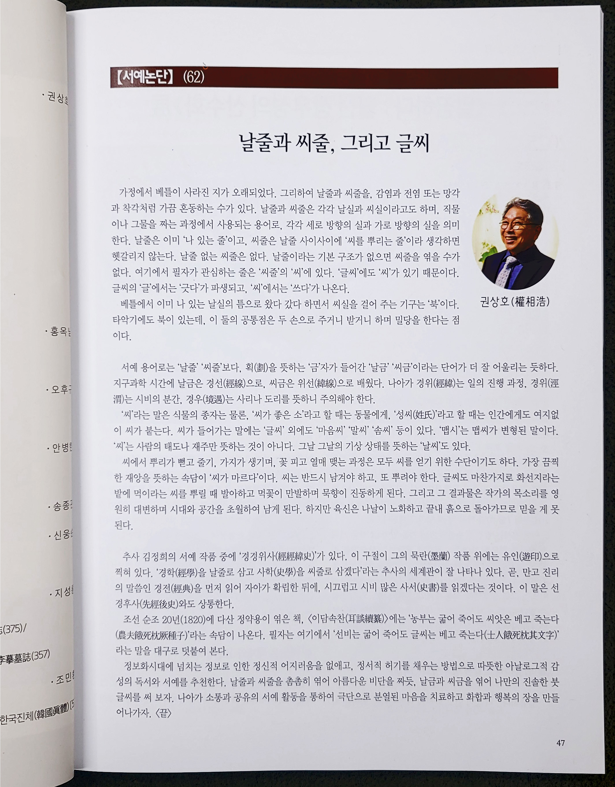 정보화시대에 넘치는 정보로 인한 정신적 어지러움을 없애고, 정서적 허기를 채우는 방법으로 따뜻한 아날로그적 감성의 독서와 서예를 추천한다. 날줄과 씨줄을 촘촘히 엮어 아름다운 비단을 짜듯, 날금과 씨금을 엮어 나만의 진솔한 붓글씨를 써 보자. 나아가 소통과 공유의 서예 활동을 통하여 극단으로 분열된 마음을 치료하고 화합과 행복의 장을 만들어나가자. <끝>