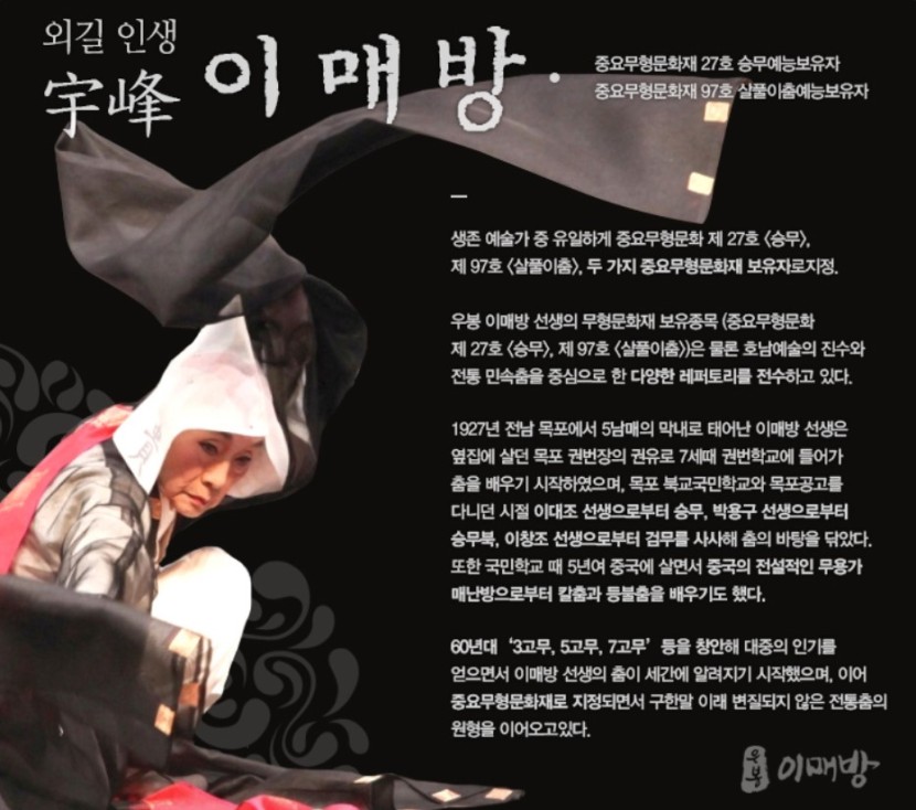 승무는 원래 승려의 수행 춤이었으나, 이매방은 그것을 무대예술로 승화시켜 한국 전통춤의 대표작으로 만들었다.